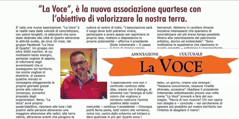 E’ nata una nuova associazione. “La Voce” è la realtà nata dalla volontà di concretizzare, con azioni tangibili, le attenzioni che sono state dedicate alla città di Quarto attraverso le attività svolte, da circa 10 mesi, dal gruppo Facebook “La Voce di Quarto”. Un gruppo con oltre 5000 membri, di cui moltissimi tanto energici, partecipi vogliosi di sapere, di informarsi degli avvenimenti che si susseguono sul territorio, ma anche vogliosi di divertirsi, di passare qualche minuto in compagnia alleggerendo le proprie giornate grazie anche alle rubriche (oroscopo, proverbi) proposte dagli organizzatori. Bene, “La Voce” avrà proprio quest’obiettivo, riportare alla luce i lati positivi delle persone attraverso una maggiore attenzione alle radici, alla terra nativa, attraverso eventi che pongono la cultura al centro di tutto. “L’associazione sarà il luogo dove tutti potranno vivere, partecipare e avere spazio per esprimere le proprie idee, mettere a disposizione le proprie potenzialità – afferma il presidente Giulio Intemerato – Il paese è ricco di risorse umane, artistiche, storiche ed il nostro intento è dare voce a queste ricchezze”. Sorrisi e battute fanno trasparire la semplicità con cui opererà quest’associazione che punta anche sull’amicizia, sulle complicità positive. “L’associazione vive con il confronto continuo delle idee, cresce con il dialogo, si alimenta con l’energia di tutti coloro che vogliono e vorranno costruire l’anima positiva della nostra comunità – continua il presidente – Chiunque potrà farne parte, tutti coloro che vorranno, come noi, uscire dallo schermo ed iniziare a dare qualcosa in più per Quarto sono i benvenuti. Abbiamo in cantiere diverse iniziative interessanti che speriamo di concretizzare nel più breve tempo possibile. Mirano alla valorizzazione del patrimonio artistico, storico ed ambientale”. “Sono moltissime le aspettative che riponiamo in questo progetto – sottolinea il vicepresidente Caterina Laita – E’ molto importante riportare a Quarto, così come per ogni territorio, la cultura dell’essere. Il conoscere ciò a cui si appartiene è alla base della consapevolezza personale e questo dovrebbe essere priorità di tutti. Giulio, io e gli altri soci, insieme a quanti vorranno unirsi a noi, siamo pronti per giocare questa carta. In paese ci sono numerose associazioni, potrebbe essere bello, un giorno, creare una sinergia”. “Nessuna concorrenza, nessuna rivalità sfrenata, eccessiva” ribadisce il presidente Intemerato sottolineando ancora una volta come “La Voce” proverà a fare del suo meglio. “Paura di non riuscire? Chi non opera non sbaglia e – conclude – noi cercheremo di operare più possibile sul nostro territorio con l’intento di sbagliare il meno”.